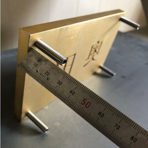 ・表札裏に4本ボルト(直径6mm)がついています。実物を使い、設置場所に的確に墨づけをして穴を開けてください。