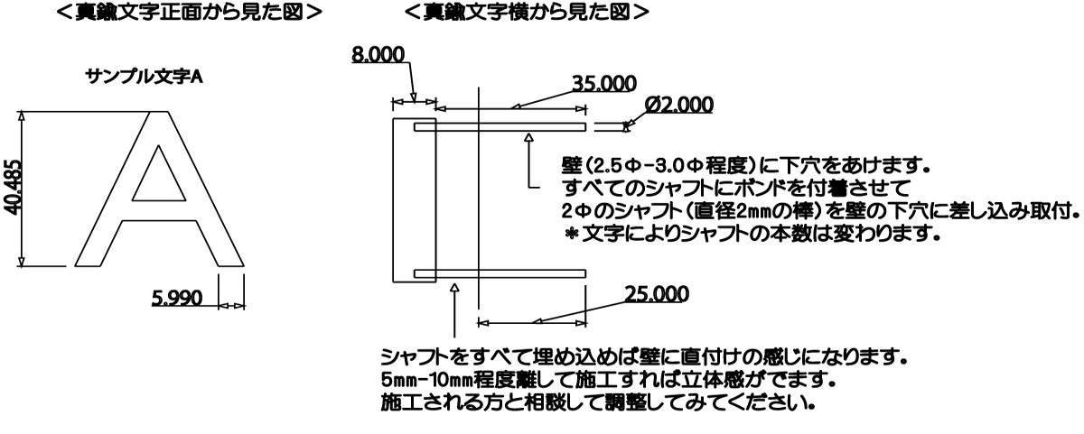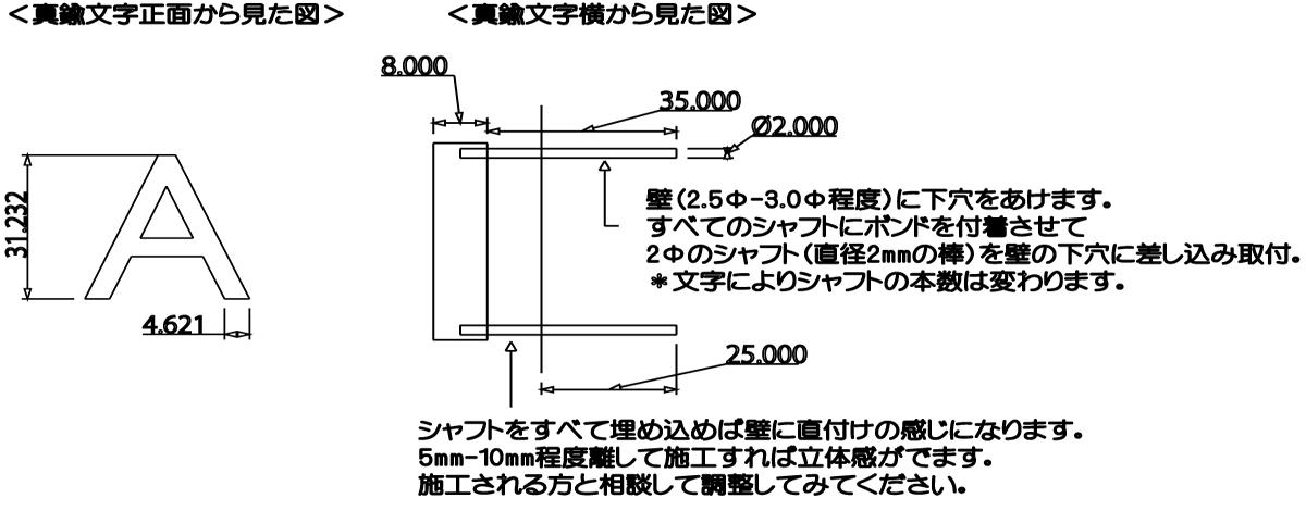 ・壁に取り付けるためのシャフト(ピン)が必要な時はオプションで1文字+3.080円(税込)でお付けできます。シャフト(ピン)の太さは直径2mm,長さは34~35mm程度です。